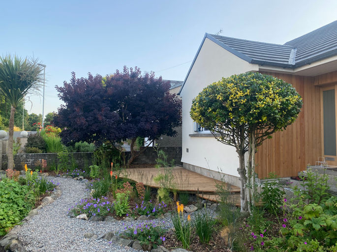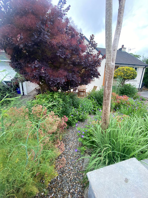 Front Gardens are often an under appreciated and overlooked space, often simply paved over to make room for another car or grassed over and forgotten. In my humble opinion this is such shame, a front garden is not only a space that can be greatly exploited to add another area where pollinators can thrive but also add value both to yourselves and your property (it is the first thing anyone will see when looking at your house). In this instance the front garden was a south facing space with views across the river Kent on a quiet private road. This offered a chance to design a rather unique front garden to be used not just viewed by the clients. The design incorporated a curved decking to float over the contemporary feel hardy perennials and grasses. A curved path would dissect the borders and flow through the garden, a subtly ode to the river beyond and a good option to help elongate the perception of the garden.