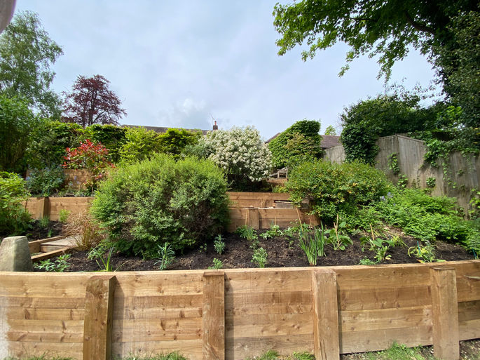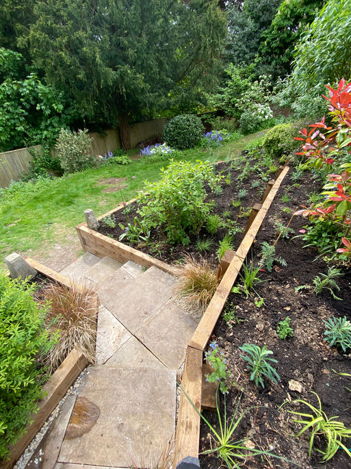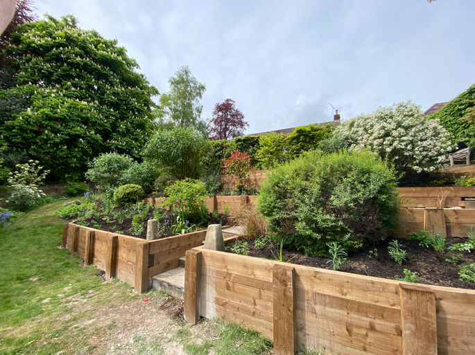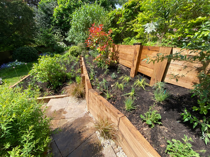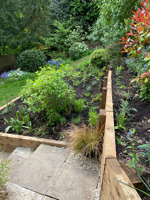 A garden in Winchester with a very steep garden that was beginning to show the signs of slipping. a large amount of treated timber sleepers (over a quarter of a kilometre) was judged the best option to stabilise the slope, along with steps and a walkway that would thread its way down the new terraced garden, filled with hardy perennials and bulbs specifically selected for pollinators. Due to access issues this entire project was done by hand, with the help of a pick axe, a spade, and a wheelbarrow